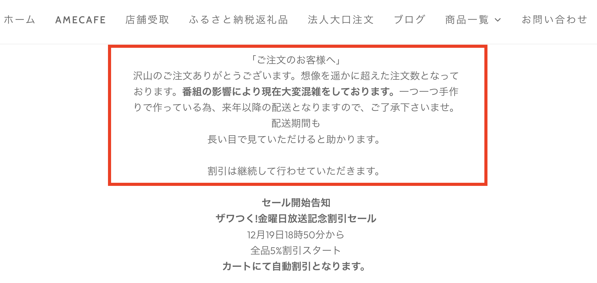 12月20日放送直後のお知らせとなります。12月19日ざわつく金曜日放送により、大変多くのお客様のご来店が予想されます。アムカフェは小さな店舗であり製造も1人で行っております。本日店舗フリー分として販売出来るのは、20ホールのみとなります。店舗にて購入が可能です。現在状況により日々状況が変わります。チーズケーキホール購入が目的の場合は、店舗にて5号ホールご予約をお願いします。