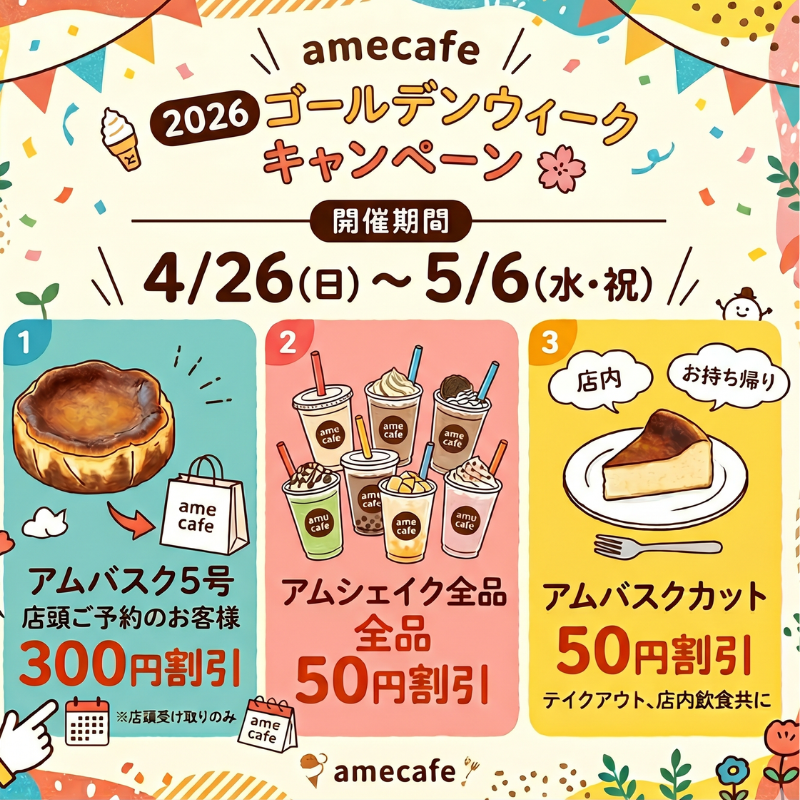 今年のGWは最大10連休!アムカフェのスイーツと一緒に、最高にハッピーな休日を過ごしませんか?混雑が予想されるため、アムバスク5号の店頭予約はお早めがおすすめです。皆様のご来店を、スタッフ一同心よりお待ちしております!
